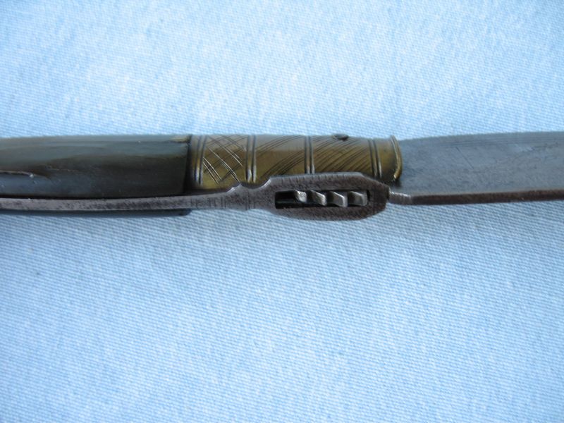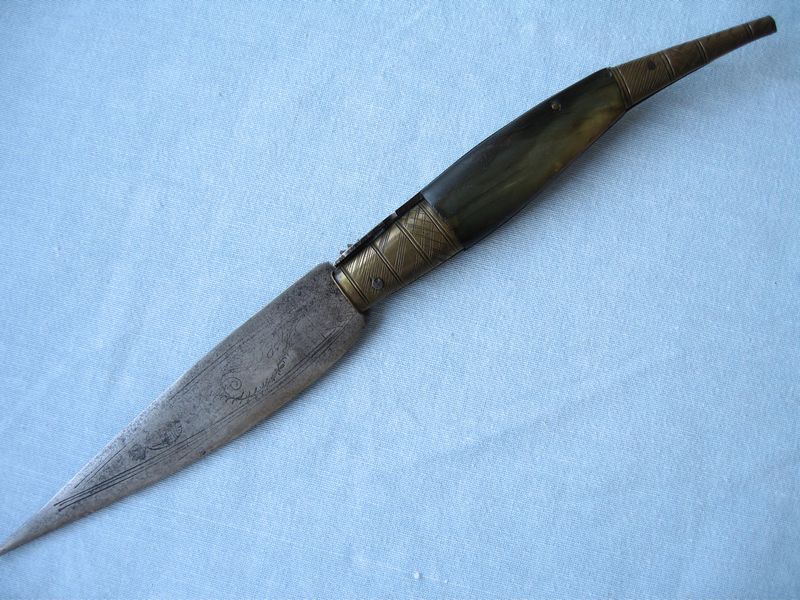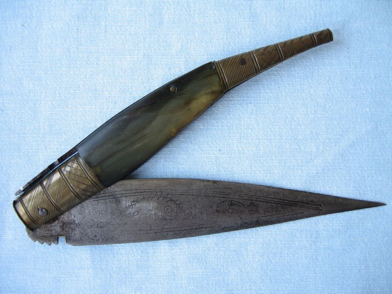 Spansk Navaja kniv har skæfte af grønt ben og ciseleret klinge. Total længde 35 cm.